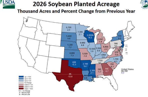 3/31/26 - Change in acres compared to last year for beans. Bean acres projected at 84.70 million acres. Up from 81.2 last year. This data was taken before the Iran war started. Will likely be closer to 85.5 million by the time planters are done.