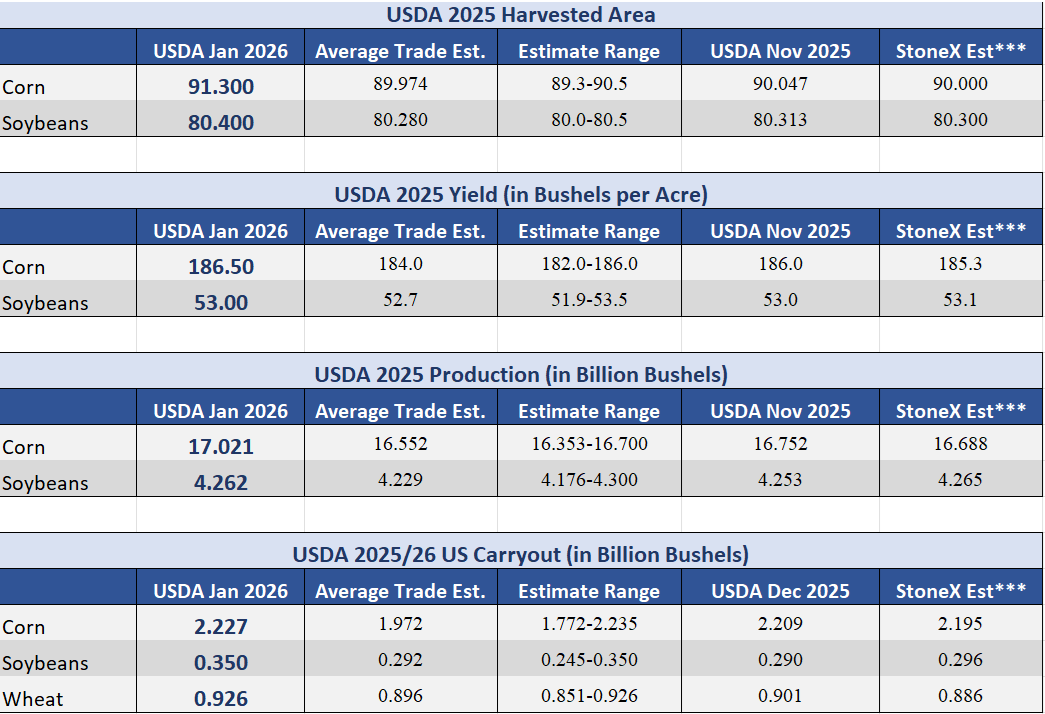 1/12/26 - Stocks report from today showed a major uptick in corn production with a 1.3 million more acres of corn harvested then previous data. Soybean production up slightly as well.